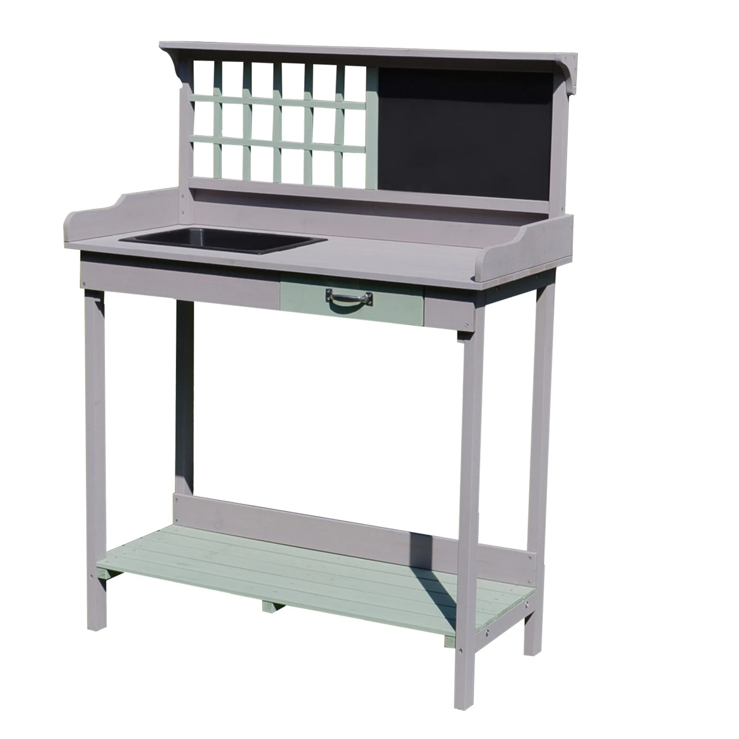 This potting table is made for all the gardening enthusiasts out there. Made from natural, solid fir wood for durability for years to come, it has been crafted into a design that will make gardening easier and more efficient, giving you more time to focus on looking after and nurturing your garden. On the top lies a large and spacious work space which features a sink to pot the plants and keep the work top tidy, alongside a blackboard to help you keep track of things instantly and a small drawer for storage. On the bottom is a shelf which is slatted to stop any water build up. You’ll have your gardening done quicker than ever!