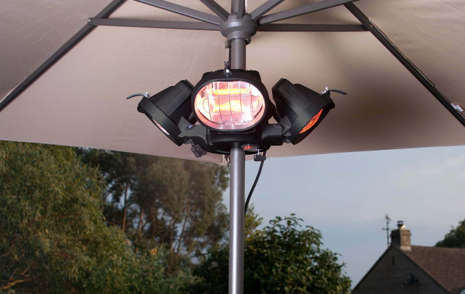 This superb parasol or tripod mounted electric heater is perfect for attaching to under parasols and can also be attached to a transportable tripod for flexibility. Four lamps will keep everyone warm on cool days and late summer evenings. With a smart hammered black finish, the Heatmaster Popular heater is both stylish and functional.
