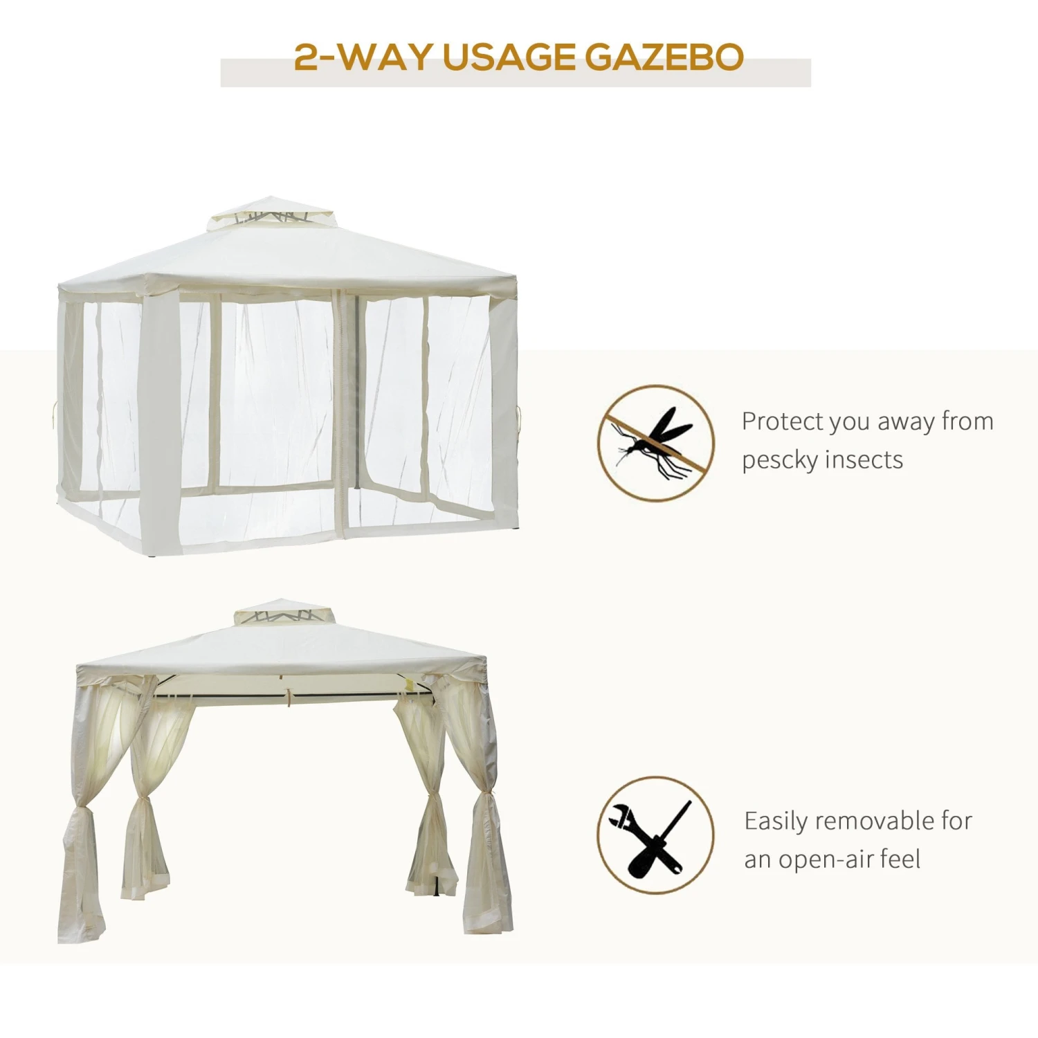 The stylish metal gazebo tent by Outsunny will turn your yard into a sophisticated and functional focal point with the stylish appearance and considerate design. The canopy top provides a perfect protection, blocking the sun’s harmful UV rays while allowing sunlight to shine through. Enclosed netting provide full protection to your outdoor livings. The solid metal construction and weather resistant polyester fabric of this beautiful gazebo party tent will ensure you and your guests can enjoy this cozy space for years to come. You and your guests are free to relax and rest under the cool shaded canopy cover. Life is meant to be enjoyed outdoors. Get out and get Outsunny!.