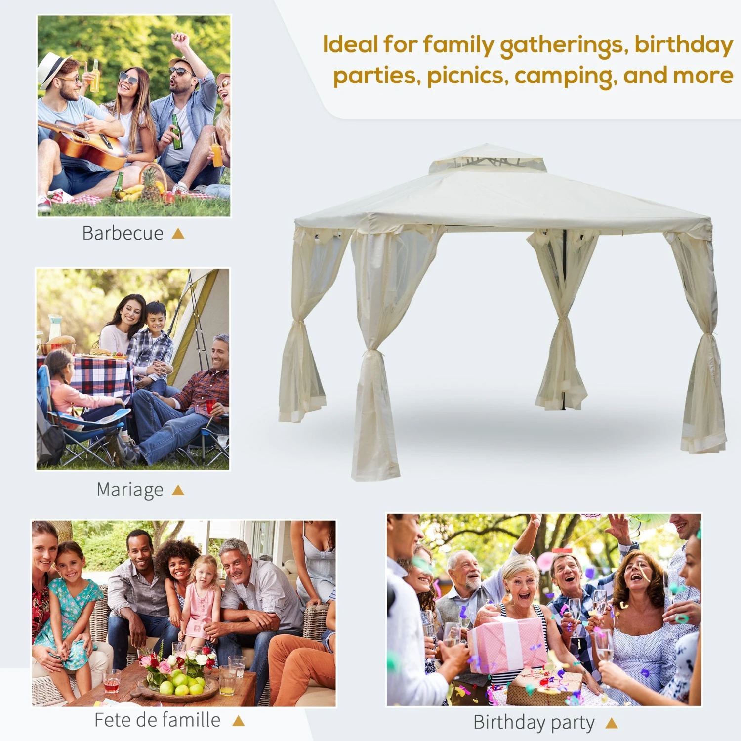 - ELEGANT DESIGN: This patio gazebo of elegant design and beautiful patterned side panels, is designed to provide cool place for outdoor parties, family picnic, camping, barbecues and social gathering.
