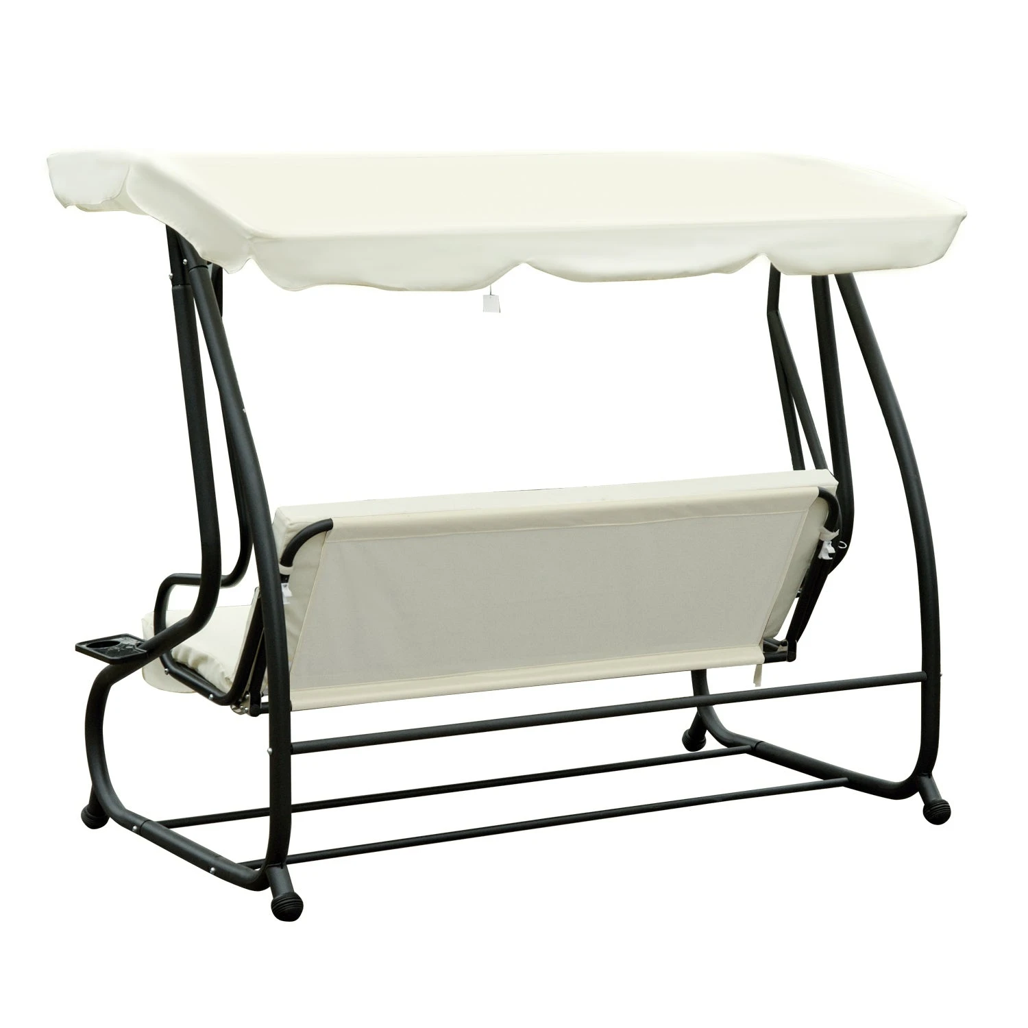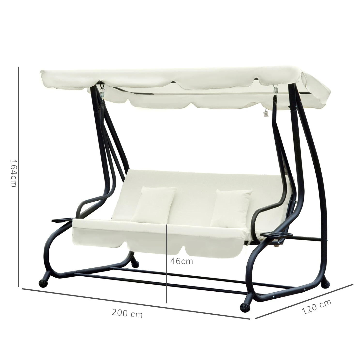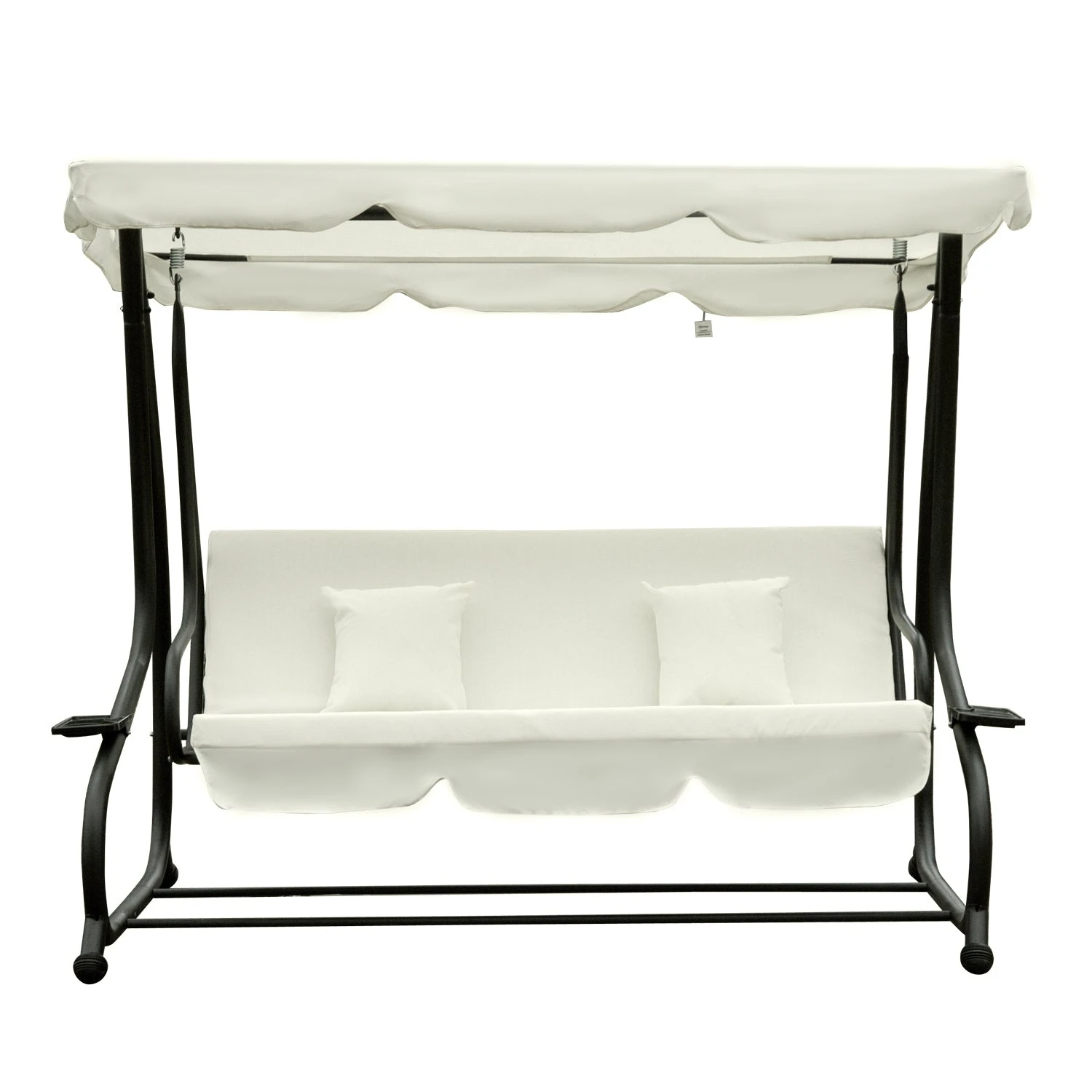 Features: – Ideal for garden, park, patio, yard, backyard and other outdoor areas. – 3 Seater swing chair converts to a comfy bed in seconds with adjustable backrest. – Finest steel pipe supporting frame and polyester cloth in excellent craftsmanship. – Seat and backrest cushion filled with 900 g/? cotton for superior comfort. – Cloth covering to provide UV protection. – 160 g/? polyester cloth is used for both canopy and cushion. – Canopy angle is adjustable to provide suitable sun shade. – Includes 2 trays to hold drinks. – Comes with 2 pillows to add even more comfort. – Assembly required.