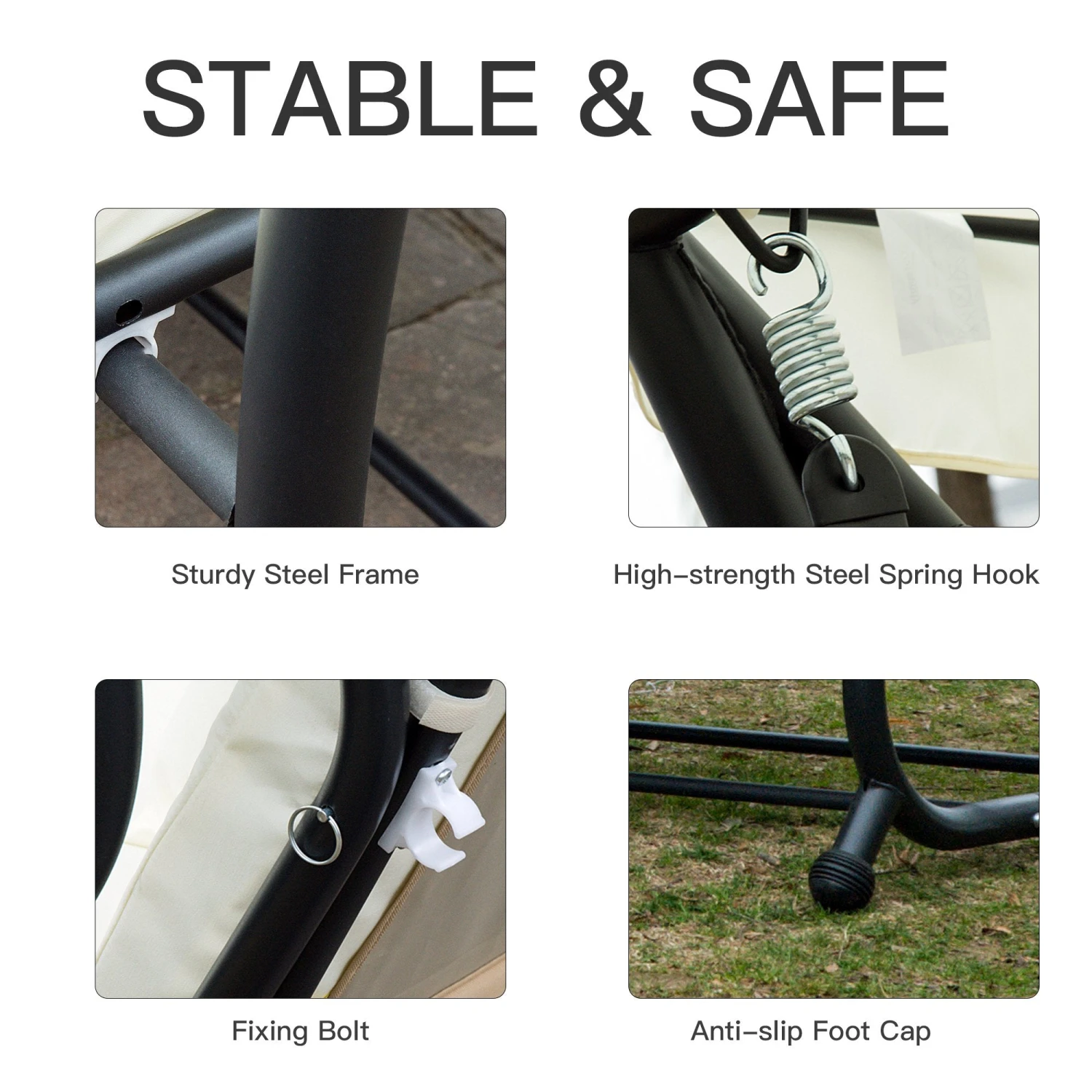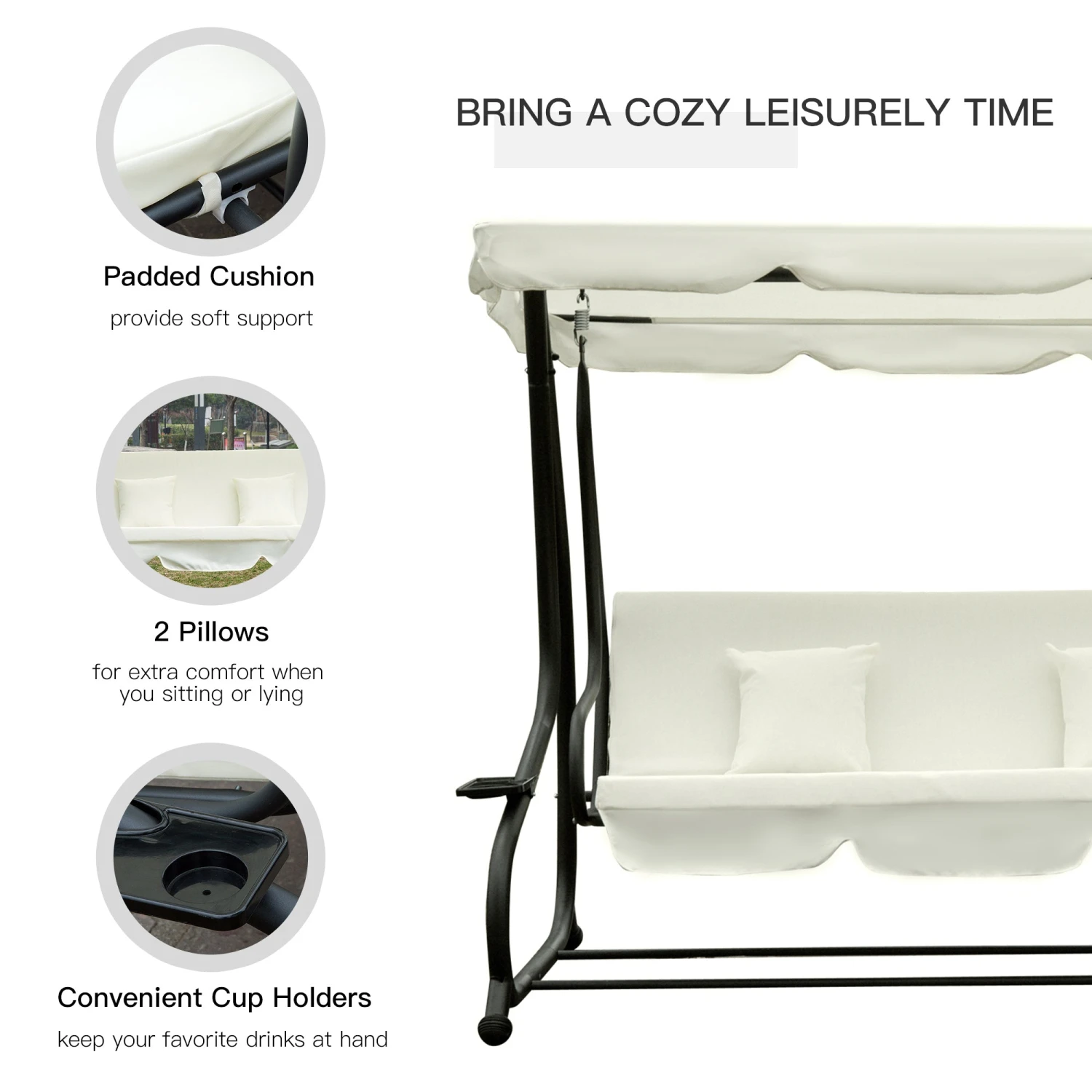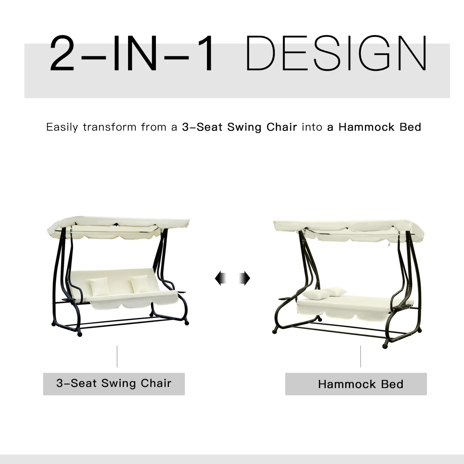 Features: – Ideal for garden, park, patio, yard, backyard and other outdoor areas. – 3 Seater swing chair converts to a comfy bed in seconds with adjustable backrest. – Finest steel pipe supporting frame and polyester cloth in excellent craftsmanship. – Seat and backrest cushion filled with 900 g/? cotton for superior comfort. – Cloth covering to provide UV protection. – 160 g/? polyester cloth is used for both canopy and cushion. – Canopy angle is adjustable to provide suitable sun shade. – Includes 2 trays to hold drinks. – Comes with 2 pillows to add even more comfort. – Assembly required.