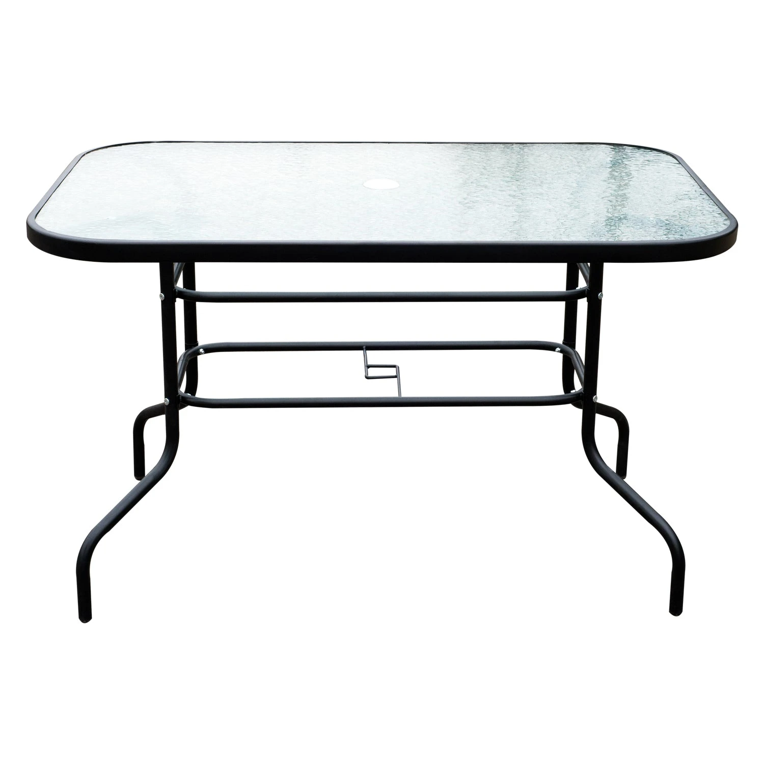 - The table features 5 mm tempered glass top and with a hole in the middle for installing umbrella which provides large sun shade.