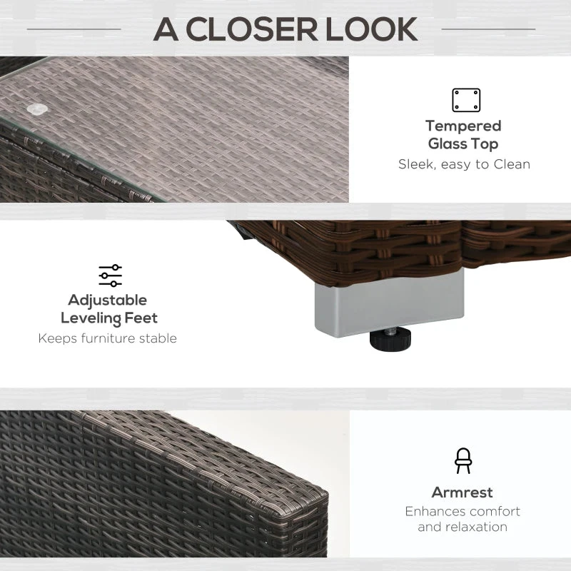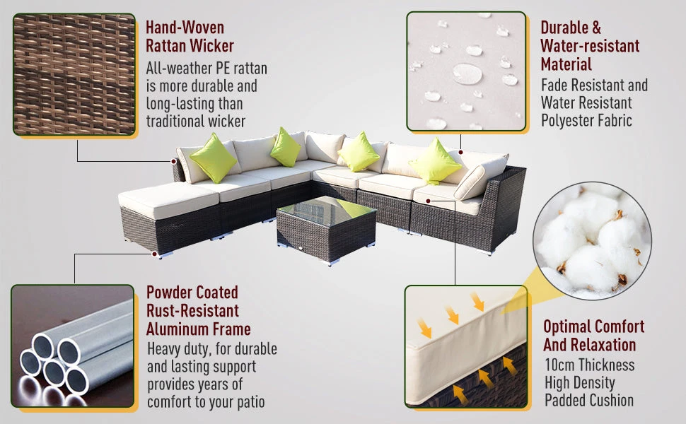 Make your garden stand out like never before with this beautiful outdoor corner sofa from Outsunny. Using aluminium for the base frame of the garden sofa to create a long-term and stable structure, each of the eight pieces included (two corner seats, four normal seats, a footstool, and table) are wrapped in mixed-grey rattan to ensure strength of the conservatory furniture, with a smooth finish that can be wiped clean easily. Padded seats and back cushions provide comfort.