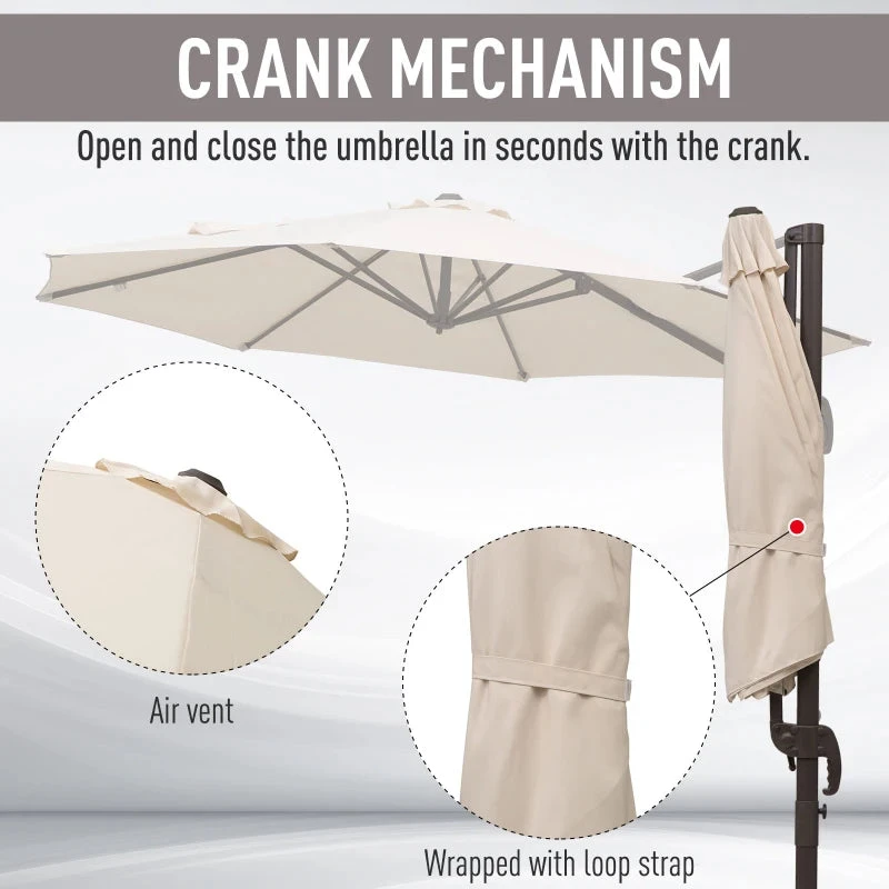 - The cantilever patio parasol rotates 360 degrees and can be tilted to various angles to suit you
