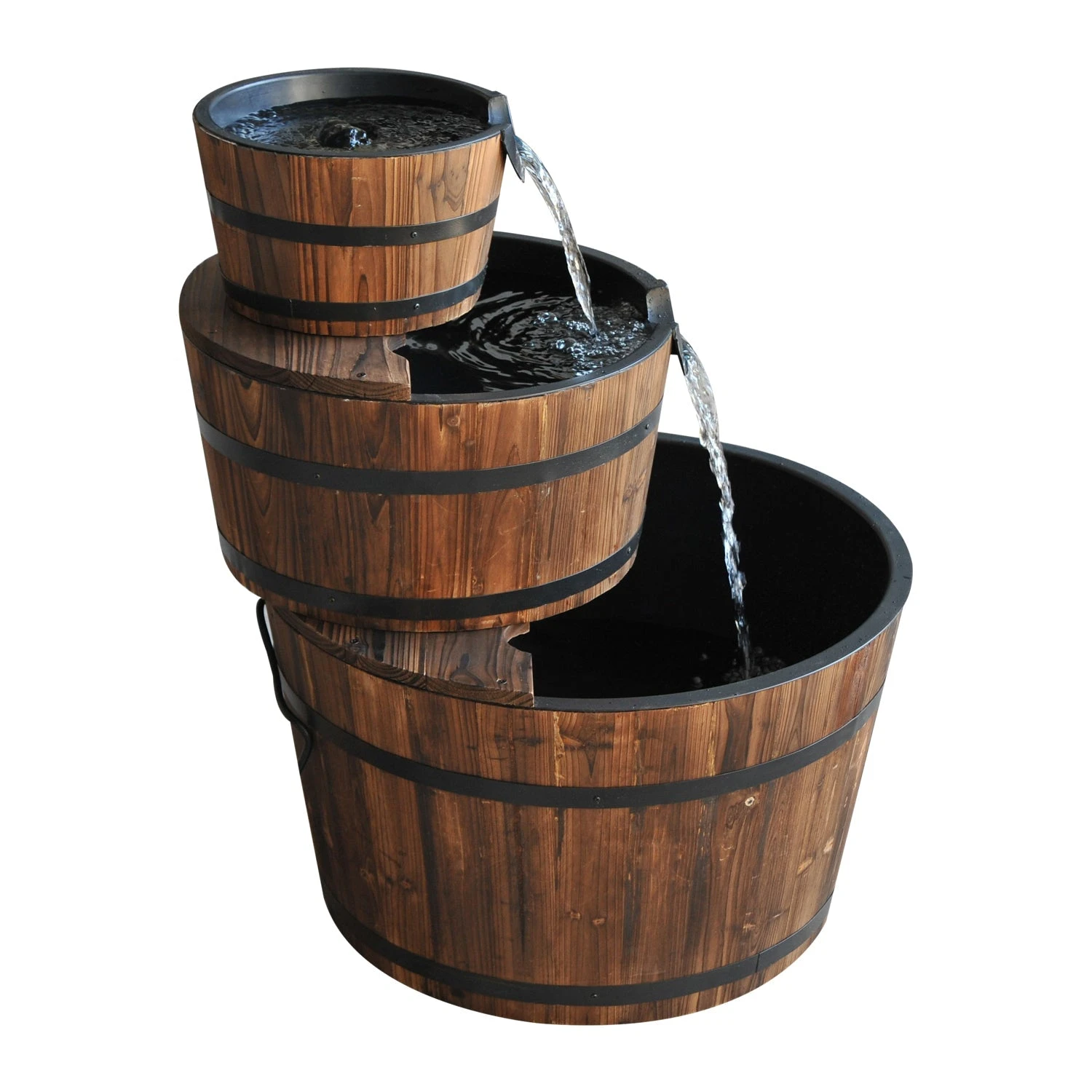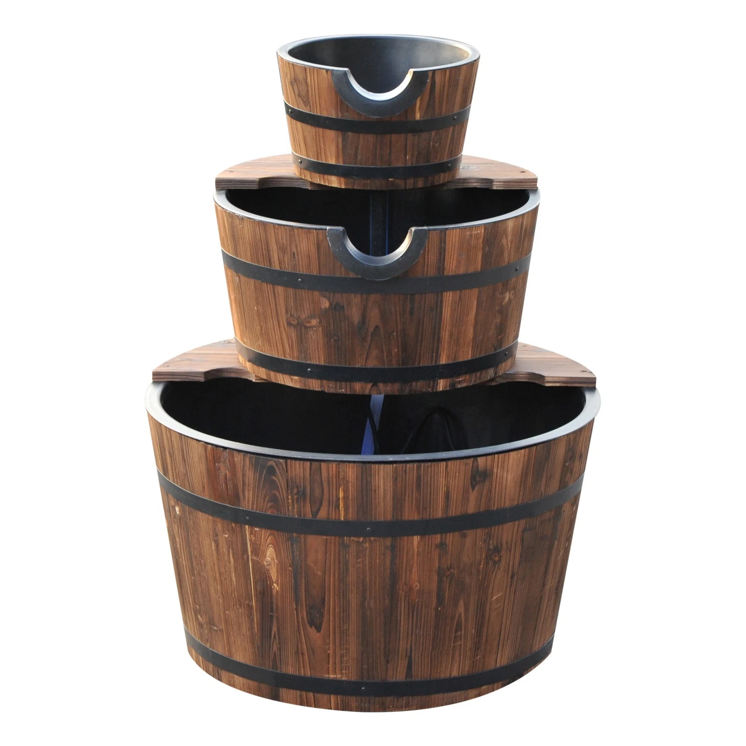 - 3-tier wooden barrels, cascading waterfalls from the first tier barrel to the bottom barrel