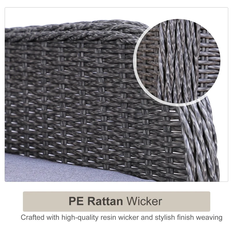 Upgrade your garden seating with this garden sofa from Outsunny create a modern look which will look great for years to come. PE wicker is wrapped around the frame of the 2 seater rattan sofa, providing extra durability and resistance against light weathering for prolonged use, with thick cushions placed on the seats and backs for comfort you’ll love sinking into. Two footstools of the conservatory furniture provide room to rest feet, with a matching table for placing drinks.
