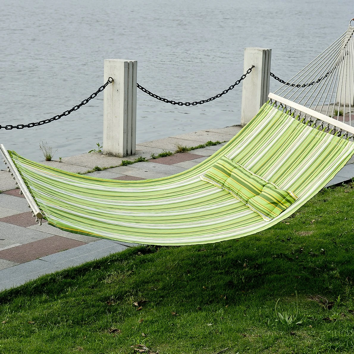 This Outsunny multicolour hammock with pillow for double person is perfect for the outdoor garden use or indoor. The bed has 2 durable metal chains and 18 ropes to easy hanging and attaching. It provides maximum comforts for you when you are sleeping or reading on it. An ideal one for you to have for travel and camping.