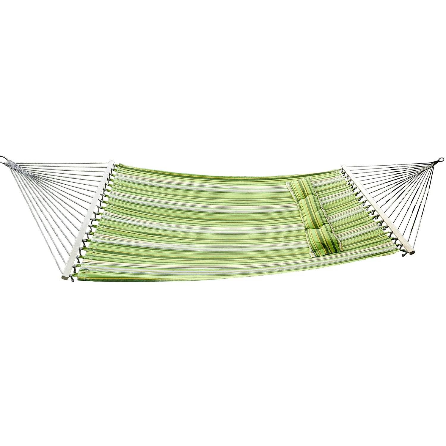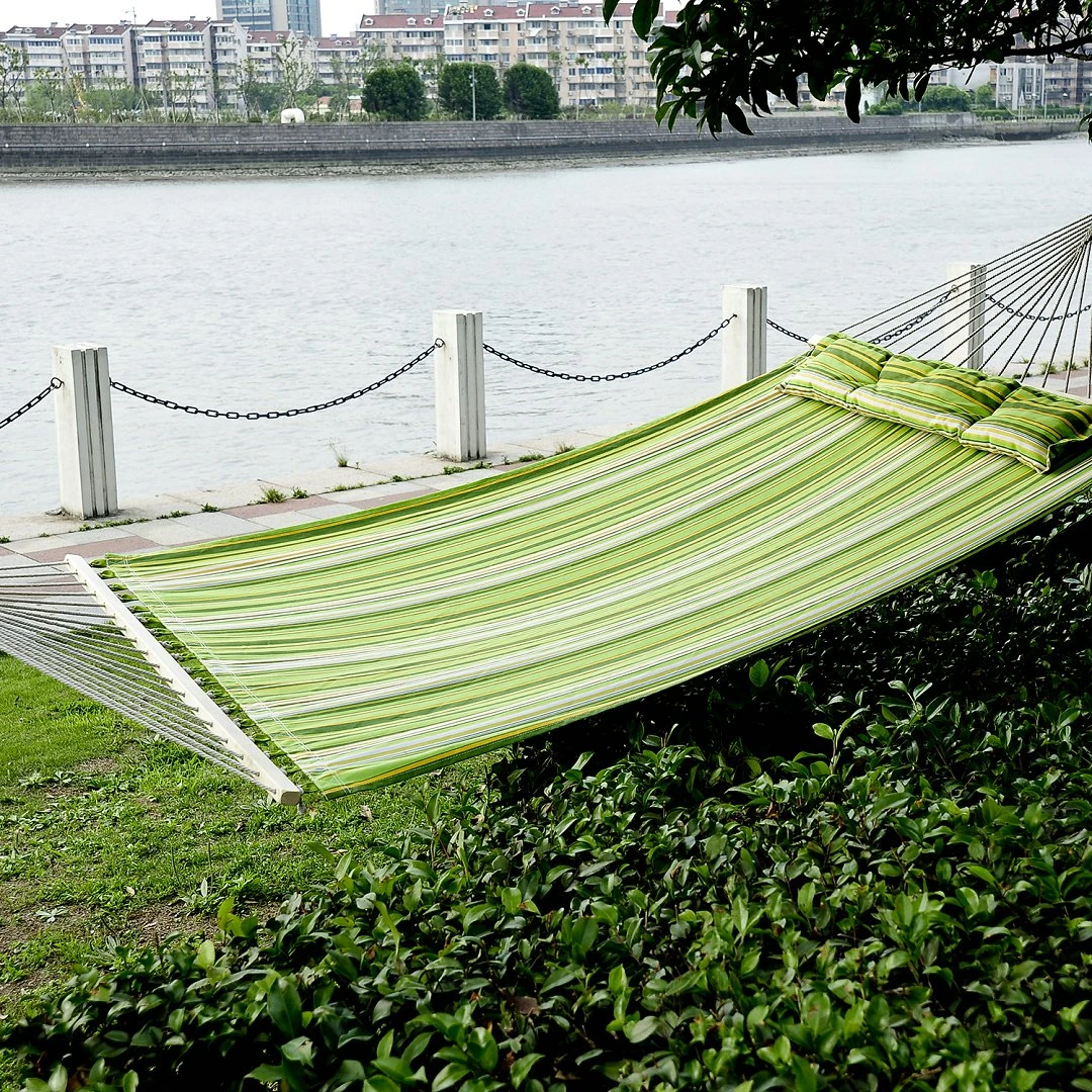 Features: – Suitable for outdoor travelling, camping, hiking or garden use. With green, yellow, white stripe for decorative appearance. Pillow filled with 500g/ cotton for comfort. 2 solid metal chain as long as 31cm. – For double person use. With 18 ropes for stable fixation