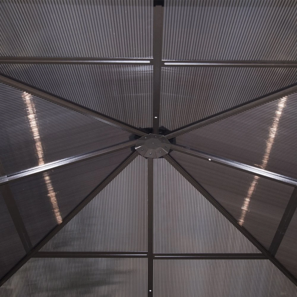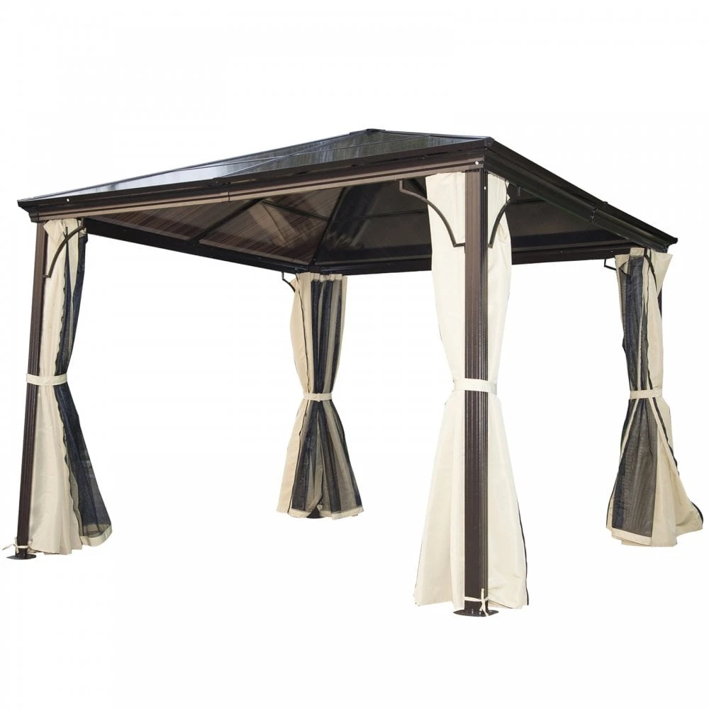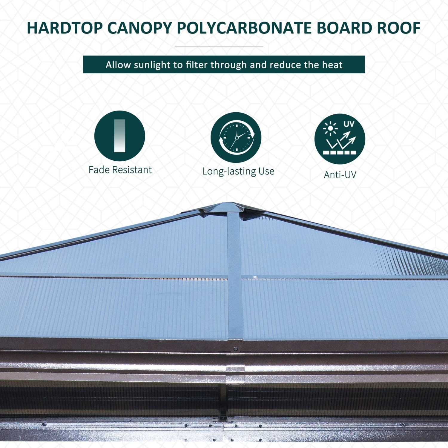 Add an elegant touch to any outdoor space with this Outsunny 3m x 3m gazebo with netting, a perfect sun shelter for any occasion! The polycarbonate roof is UV protection. Rust resistant aluminium for the frame makes it sturdy, formed into a spacious size – you can host plenty of people at once. Curtains create privacy, each with inner netting to shield you from annoying bugs and more. Life is meant to be enjoyed outdoors, so enjoy this hard roof gazebo in your own backyard space.