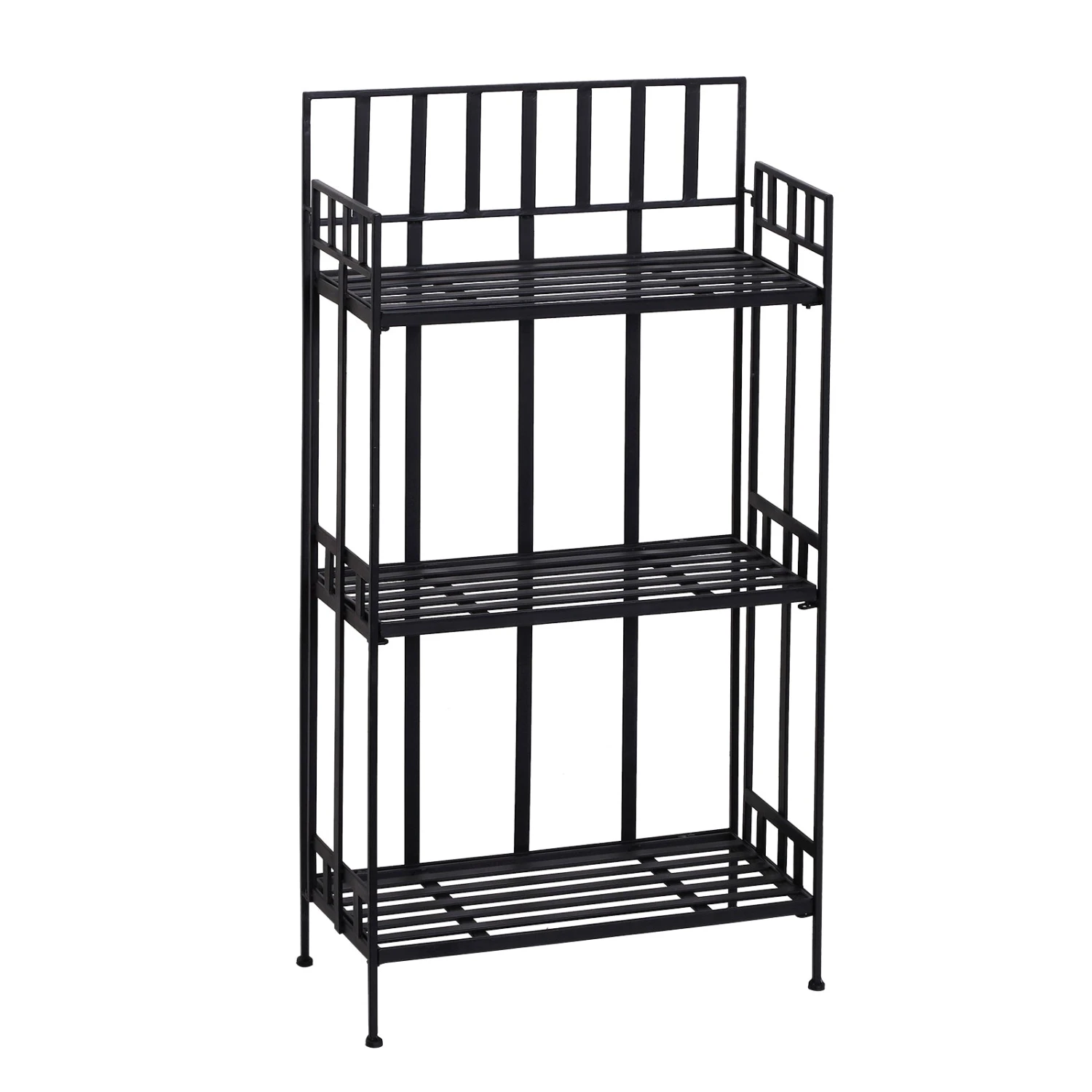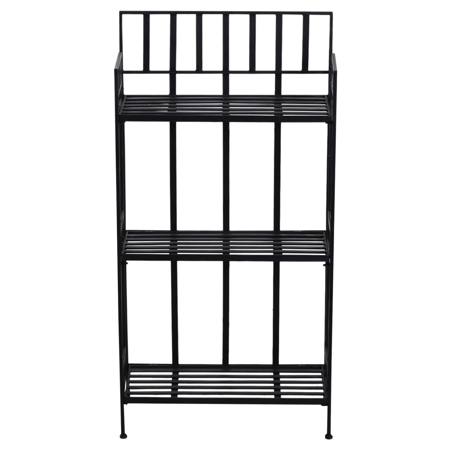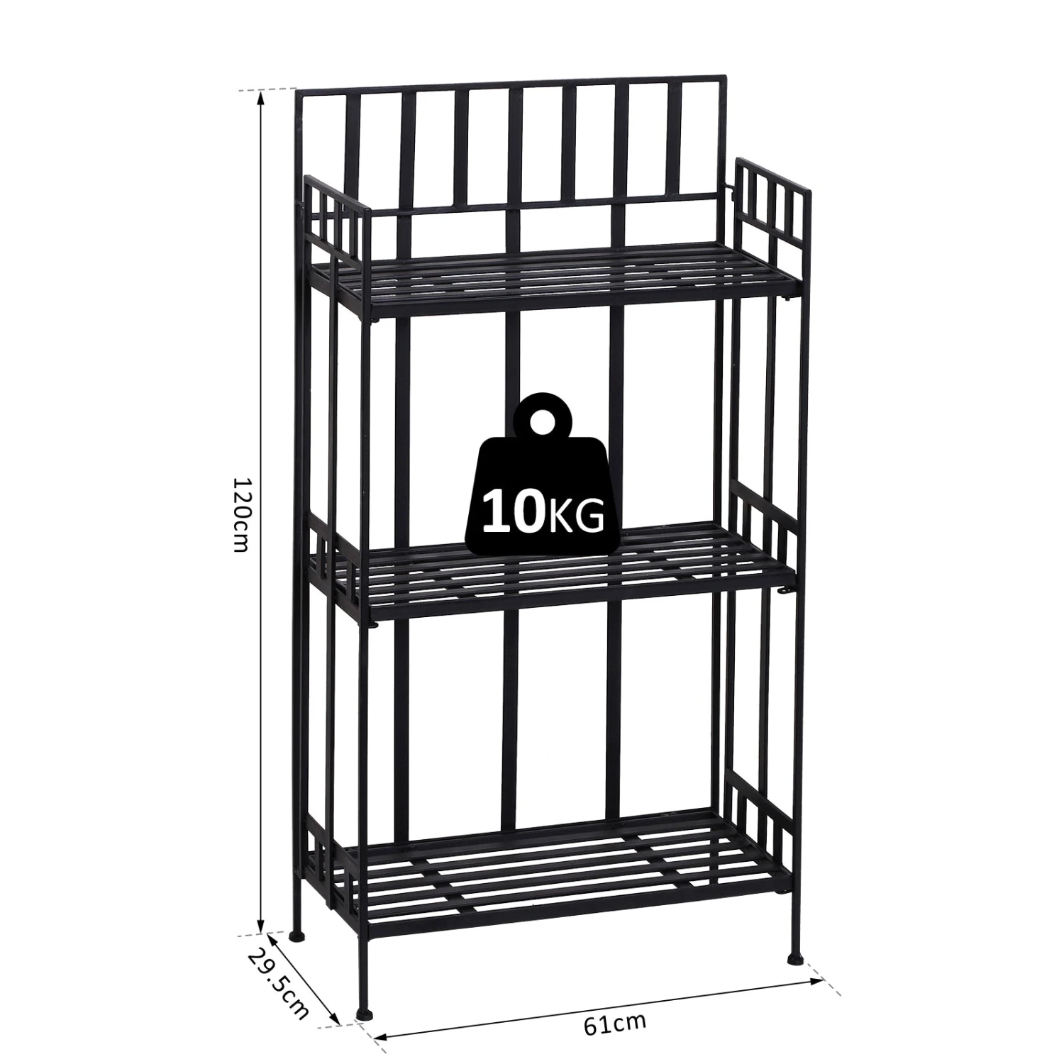 Organise outdoors w/Outsunny’s shelf. Constructed of metal w/black, powder-coated finish, it holds up to 30kg. Three shelves store flowers, plants, accessories. Foldable; easy to store away. No more storage worries.