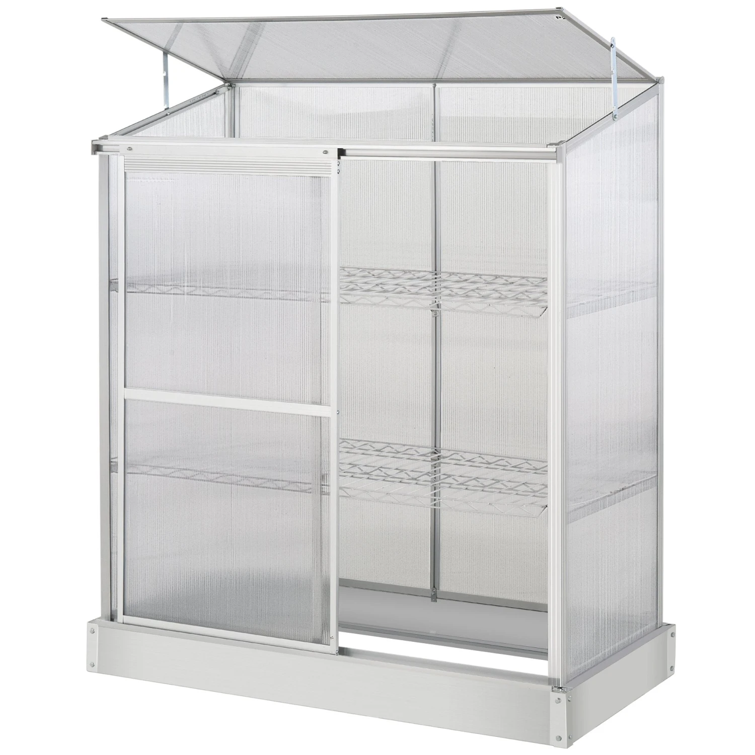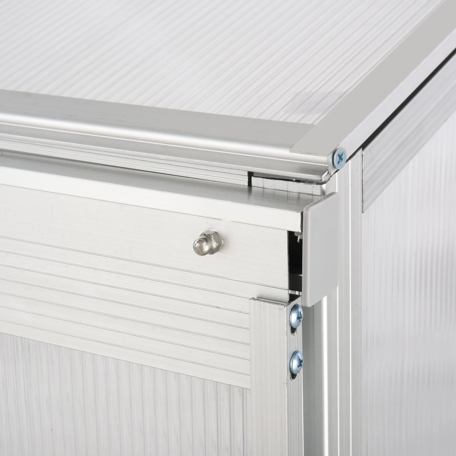 Give your plants and vegetables somewhere to enjoy the sunshine and grow heartily, thanks to this Aluminium Greenhouse from Outsunny. Small aluminium frame provides strength, with the polycarbonate panels protecting the inside from medium wind and rain, whilst allowing the sunlight to pass through. Inside two shelves are placed for organisation, with a lift-up lid and sliding door for easy access.
