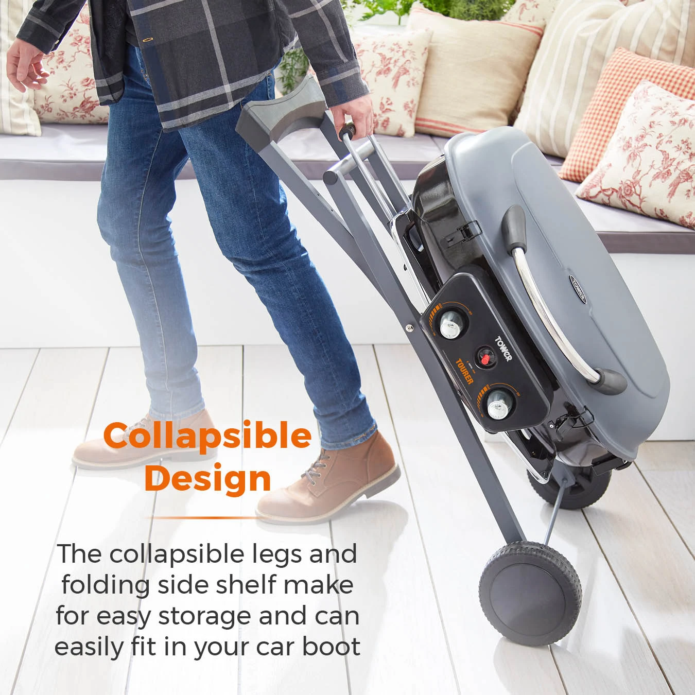 This Tower Tourer 2 gas burner BBQ is the answer to BBQ food whatever the adventure. Featuring collapsible legs and a folding side shelf, you can easily store the BBQ and fits seamlessly in the boot of your car. The BBQ is portable, with a pulling handle and integrated castor wheels; it is easy to transport the BBQ anywhere you go. The grilling surface measures at 62.6cm x 34.2cm to cater for 2 – 4 people, suitable for grilling juicy burgers, charred halloumi skewers and succulent steaks at the same time – ideal for a family camping holiday, a day out to the beach and for smaller sized gardens to entertain guests. Its powdered coated steel body is resilient against damage, while resistant to high heat meaning it will not begin to warp for continued, long-lasting use. The steel grill plates are coated in porcelain enamel are robust and easier to clean, for a seamless and effortless experience from start to finish.